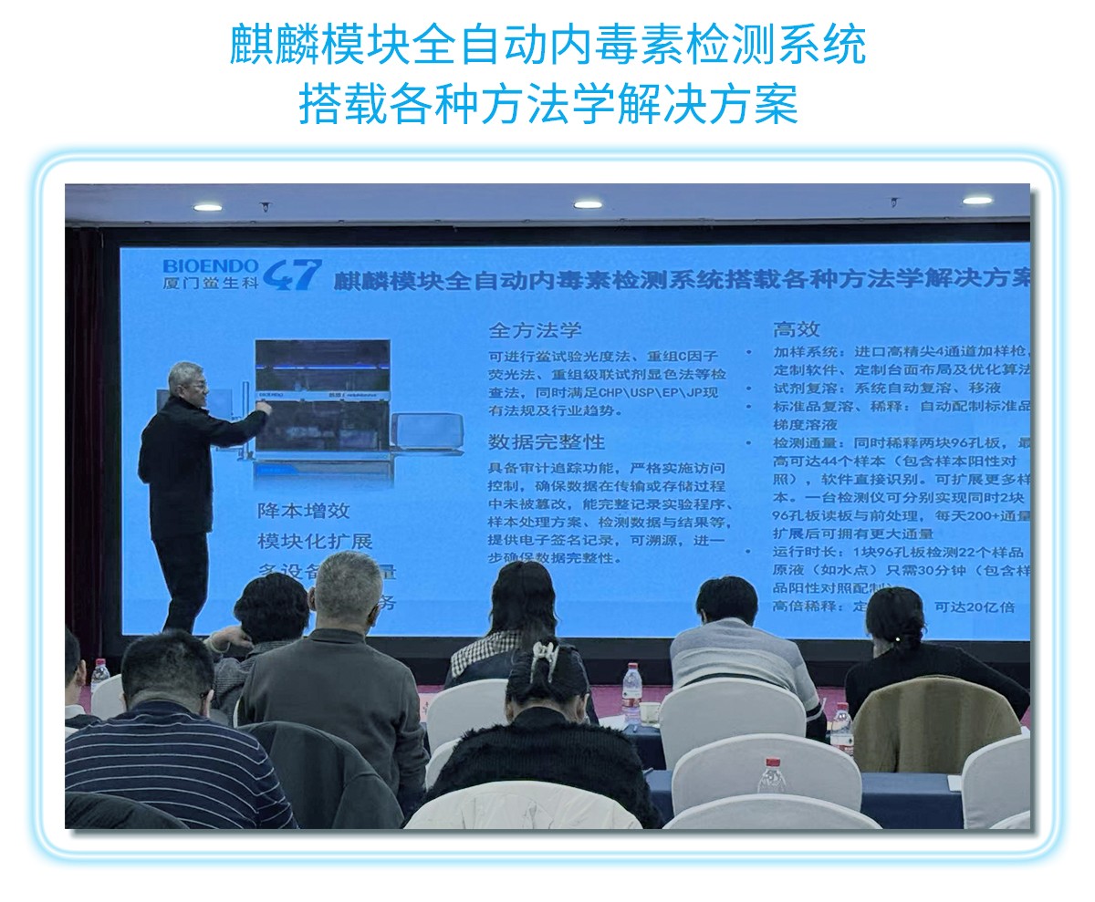 廈門鱟生科吳尚毅董事長在會議上介紹了“智檢未來+重組替代”的可持續(xù)發(fā)展內(nèi)毒素檢測全面解決方案報告。展示了廈門鱟生科47年專注鱟試劑、內(nèi)毒素檢測領(lǐng)域的發(fā)展歷程及成果,介紹了我司檢測試劑+檢測設(shè)備+專業(yè)軟件+重組試劑+全自動智能機(jī)器人+體系驗(yàn)證全面解決方案的產(chǎn)業(yè)化升級,從傳統(tǒng)鱟試劑轉(zhuǎn)型升級為AI+合成生物學(xué)領(lǐng)先企業(yè),保護(hù)鱟資源,實(shí)現(xiàn)可持續(xù)發(fā)展的戰(zhàn)略規(guī)劃,努力建設(shè)符合國家發(fā)展政策的高質(zhì)量新質(zhì)生產(chǎn)力企業(yè),助力我國醫(yī)藥行業(yè)發(fā)展。
